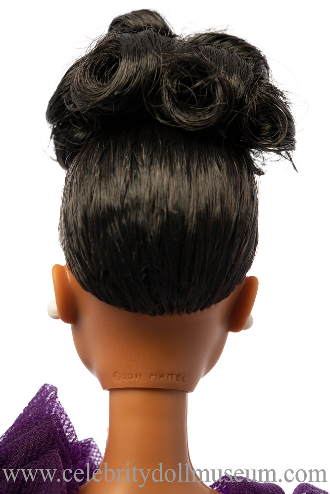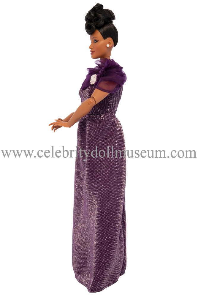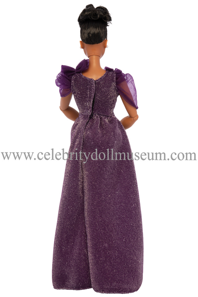 The Ella Fitzgerald doll comes wearing a soft, glittery purple waisted gown with purple tulle fabric puffed sleeves and collar. A white plastic brooch is attached with string to the left dress top tulle decoration. The dress opens in the back with a strip of black Velcro. The dress is easily removed and there is no underwear underneath.