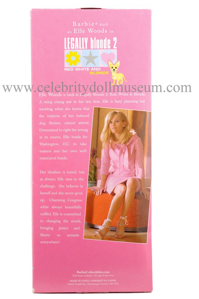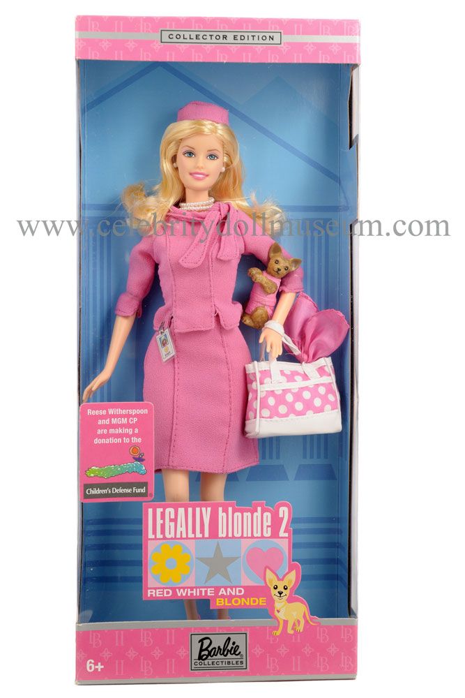 The Reese Witherspoon celebrity doll portrays her as the character Elle Woods in the 2003 sequel Legally Blonde 2: Red, White & Blonde to the original film Legally Blonde(2001). The doll was made by Mattel in 2003 in their Collector Editon: Barbie Loves Pop Culture and licensed from Metro-Goldwyn-Mayer Pictures Inc.. Witherspoon and MGM donated a portion of the doll sales proceeds to the Children’s Defense Fund, an organization dedicated to promoting and protecting children’s health, education and welfare.