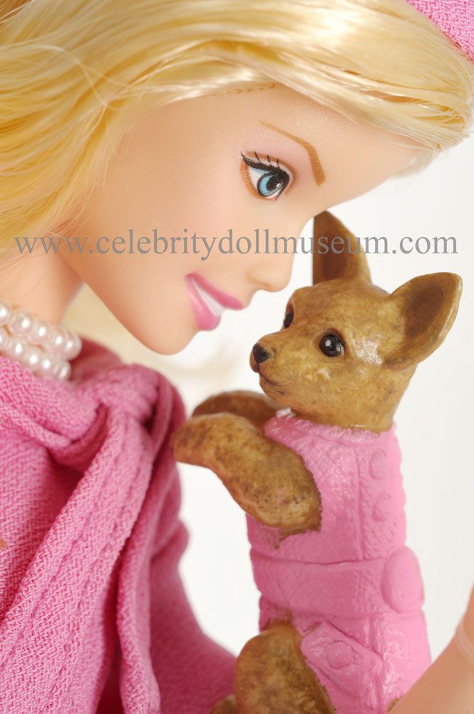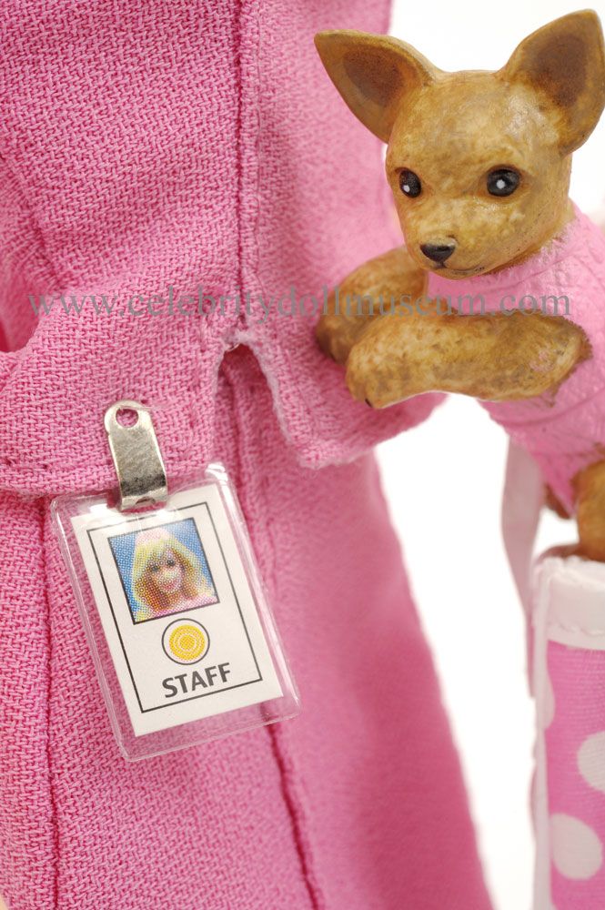 The doll is dressed in a Elle Woods replica all pink suit outfit including pearls and comes with toy movie dog Chihuahua, Bruiser (The film dog sadly died in 2016) , a pink and white polka dot bag, pink scarf, staff id badge, pink sandal high heel shoes, and a pink hat. The doll’s knees bend, arms are stiff, but neck and shoulders move in all directions. Included in the box is an unnumbered Certificate of Authenticity and a white based and clear doll stand.