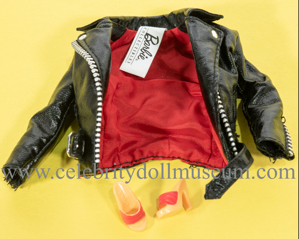The Olivia Newton-John Sandy Barbie comes wearing a replica outfit of her black leather Sandy look from the graduation carnival Grease movie “You’re The One That I Want” finale scene. The black pleather jacket has faux silver zippers on the front and sleeve bottoms, two studs, and an attached black belt with a silver buckle, and a inside red satin lining.