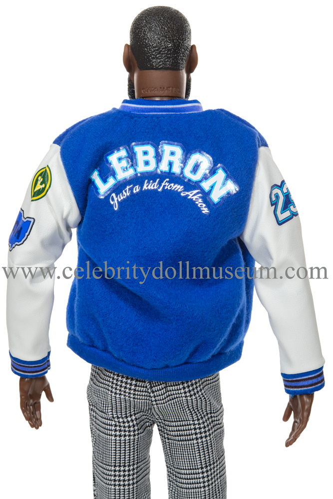 The doll comes wearing a royal blue felt bomber jacket with white pleather sleeves. The body is lined with blue material. The collar and sleeves are banded with blue and white striped knit material. The jacket is emblazoned with faux white snap button, faux white leather pocket slits, decals of patches of his initials, a map of Ohio, his number 23, and the green and gold logo of the LeBron James Family Foundation. Across the back is a large curved “LEBRON Just a kid from Akron” decal. Underneath the jacket is a black short sleeved knit t-shirt with a decal of WE ARE FAMILY and another green and gold logo on the front. The t-shirt does not open and must be pulled over the head.