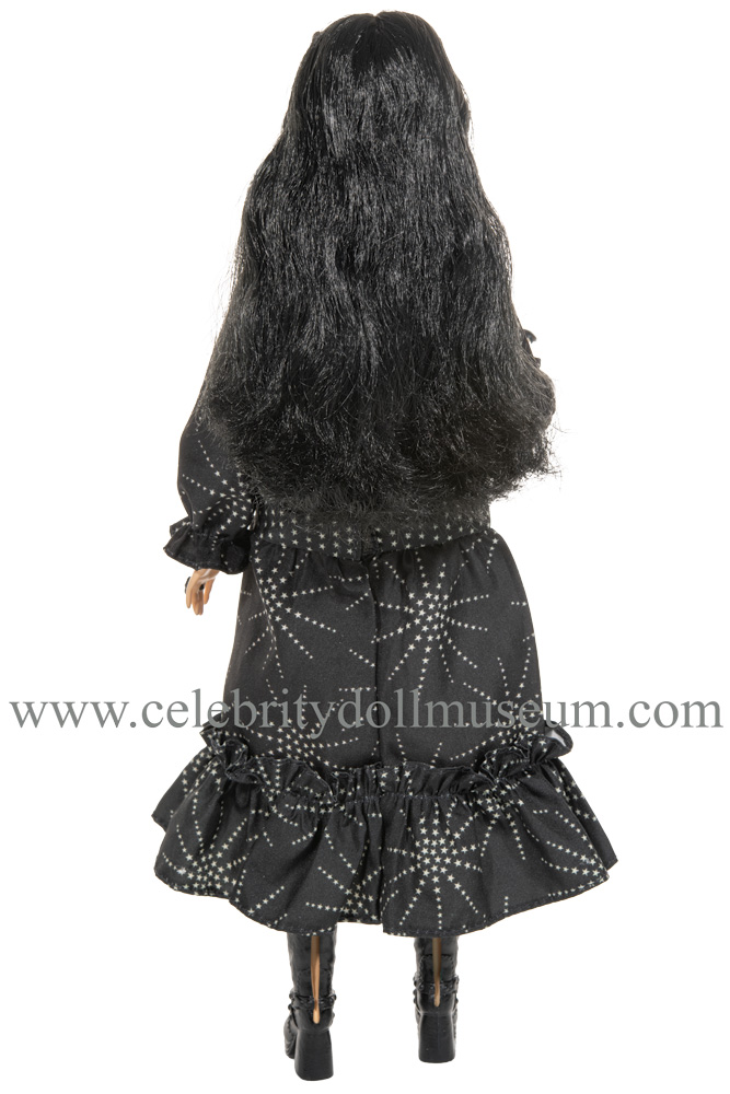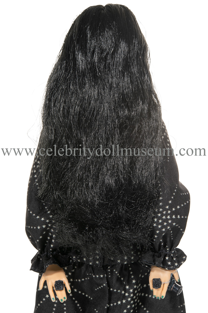 On her feet are a black plastic doll version of the chunk heel boots designed and worn by Anna Sui. Similarly with the black plastic dangle earrings and the two large plastic ring inserts.