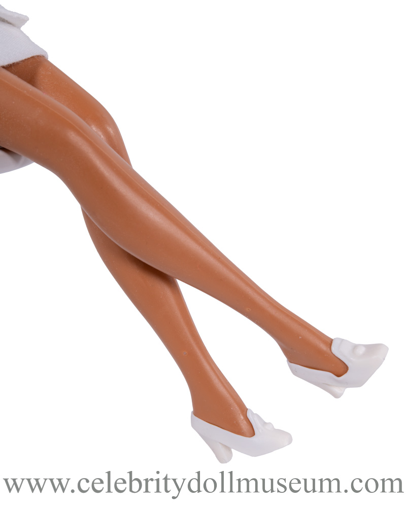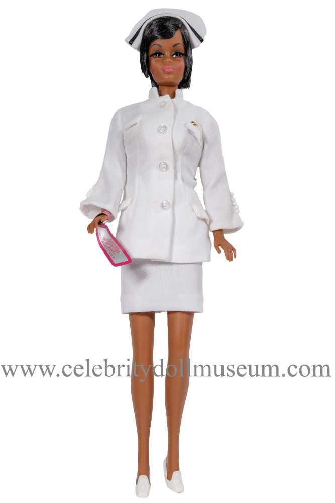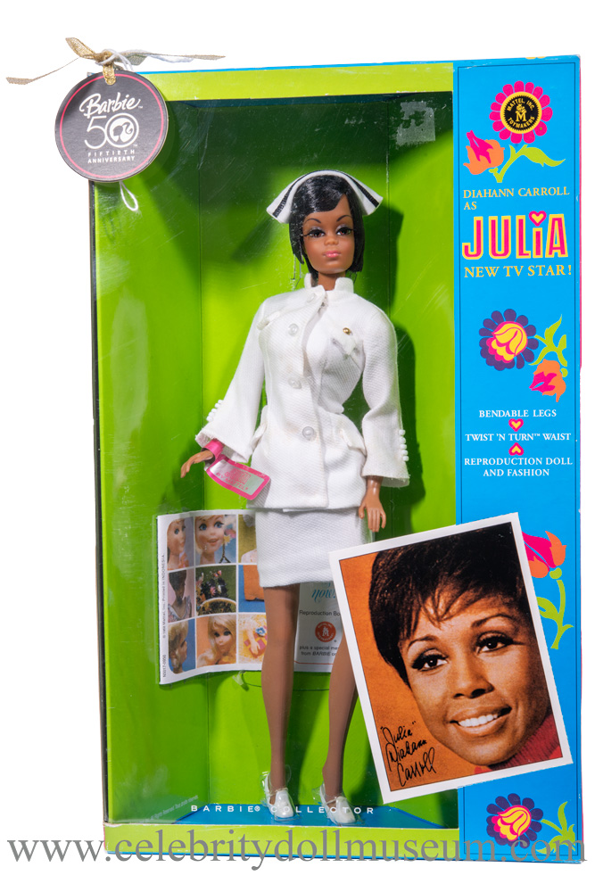 The Diahann Carroll celebrity doll portrays her at 33 years old the role of Julia Baker from the 1968-1971 TV sitcom Julia. Carroll played a nurse in the first sitcom depicting an African American as not a servant or a slave. In 2009 Mattel made this 50th anniversary reproduction of the original 1969 Twist ‘N Turn doll and it retailed for $50. During the shows popularity a talking version, a gift set, and four Julia outfits were produced. To read more about the original Julia dolls visit https://www.dollreference.com/julia_doll.html