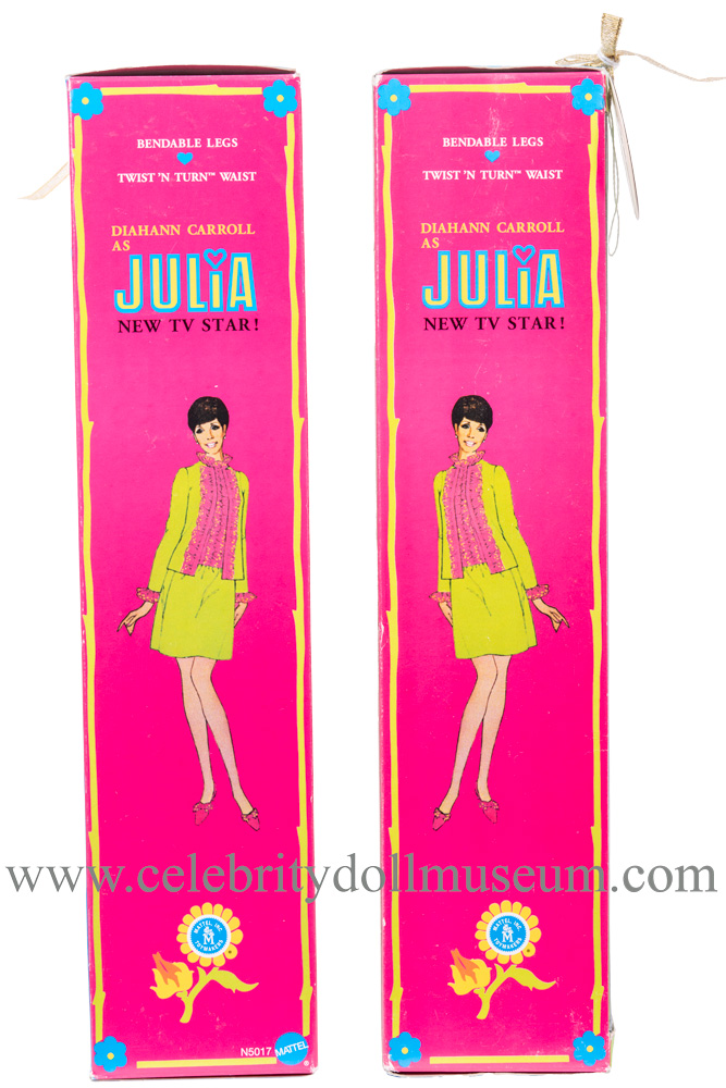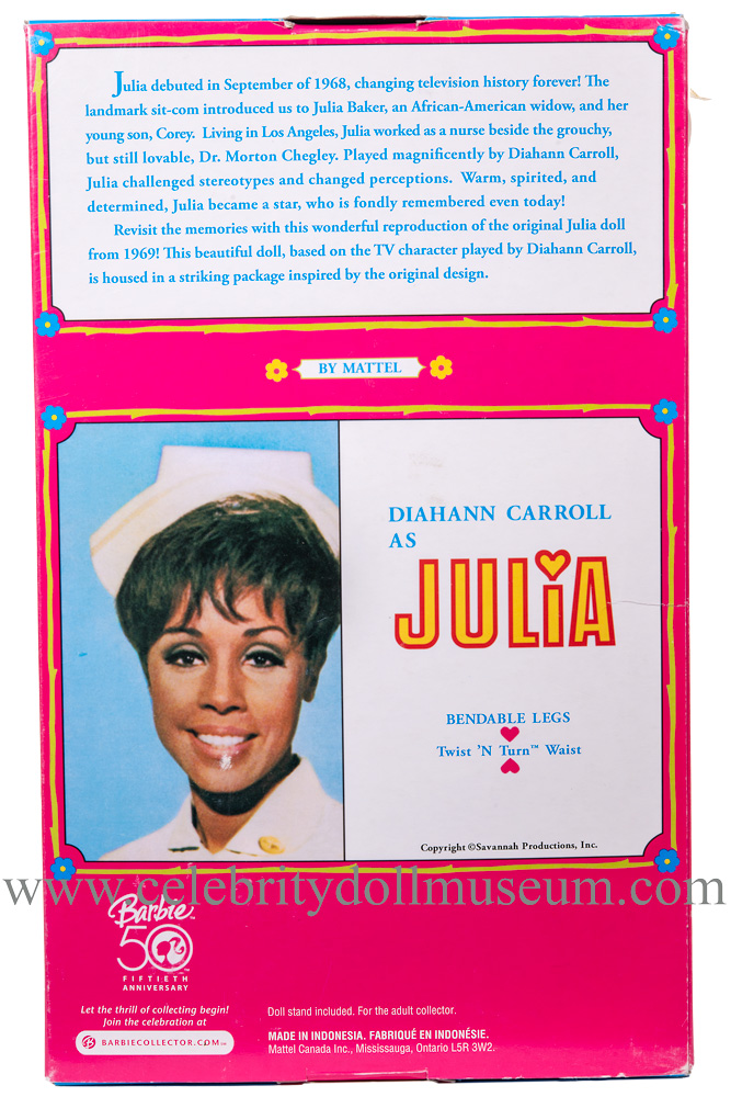 Revisit the memories with this wonderful reproduction of the original Julia doll from 1969! This beautiful doll, based on the TV character played by Diahann Carroll, is housed in a striking package inspired by the original design.