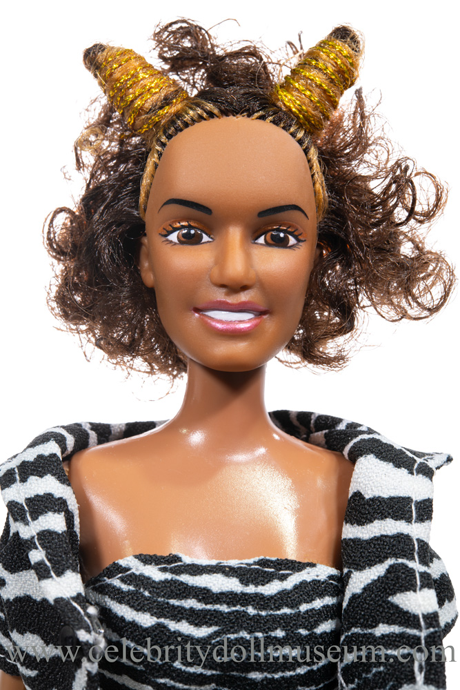 The Scary Spice doll comes wearing a cotton zebra print shorts and tube top with a midi-length, short sleeved collared coat. The tube top and short shorts both open in the back with Velcro. The coat closes with a plastic snap at chest level and is designed to hang open the rest of the way down in the front. A small plastic black button is sewn over the snap for decoration. On her feet are white plastic reverse zebra print knee high platform boots with white soles. A plastic gold snake bracelet is wrapped around doll’s left arm bicep and a plastic metallic gold ring is plugged into the hand below.