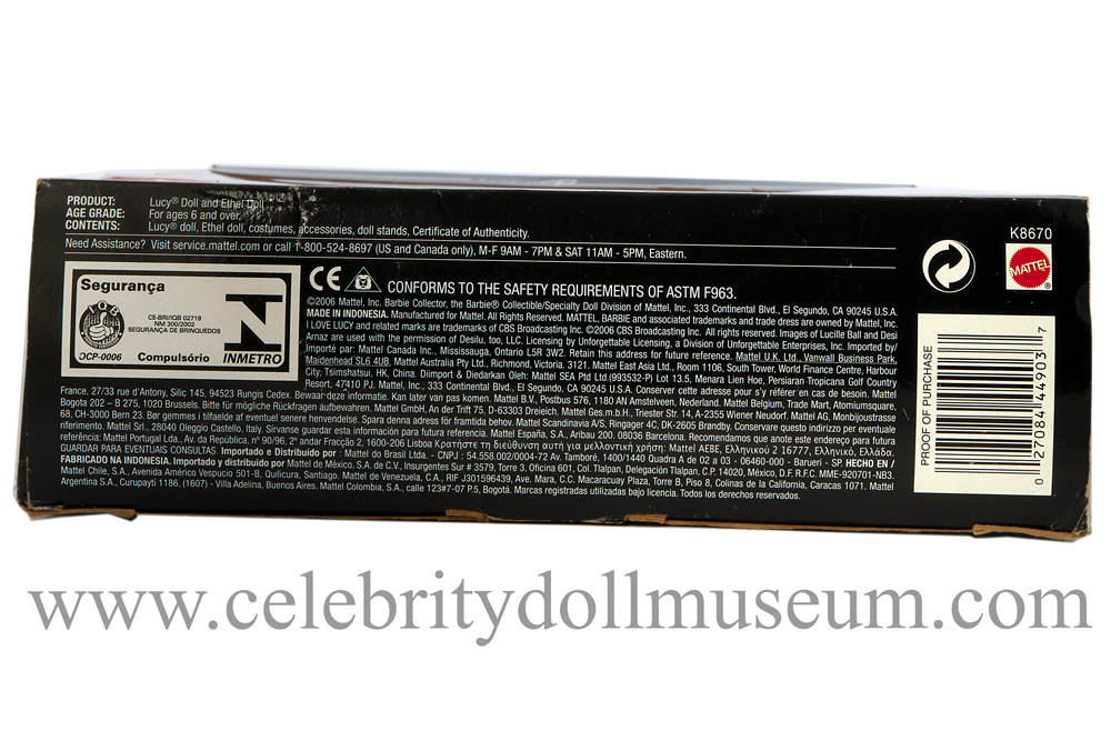 The Lucille Ball celebrity doll depicts her as Lucy Ricardo from the Episode #69: “Lucy and Ethel Buy the Same Dress” of the CBS show I Love Lucy. The doll is part of a two doll set with Vivian Vance (Ethel Mertz) and was made by Mattel in 2006.